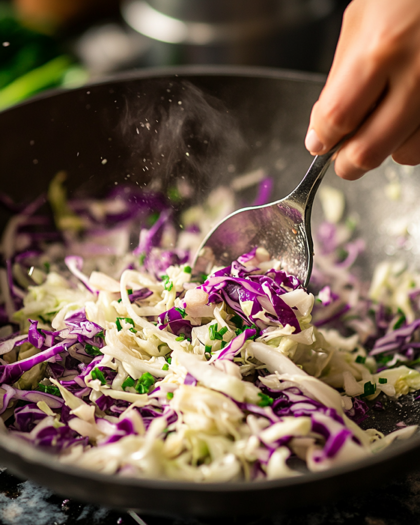 Begin by preparing all your ingredients. Chop the cabbage into bite-sized pieces, dice the onion, and mince the garlic. Having everything ready makes the cooking process smooth and prevents overcooking any one component.