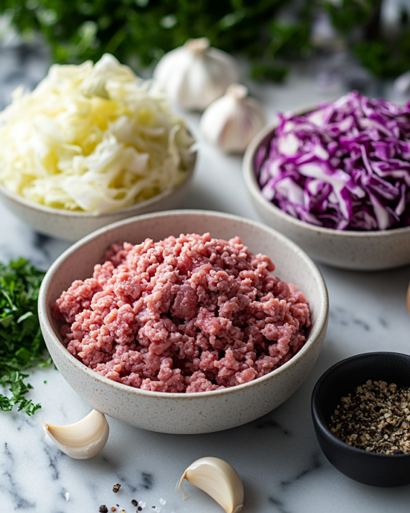 The success of a beef cabbage skillet depends on a handful of humble ingredients that work together in a very natural way. Ground beef forms the base of the dish, bringing depth and a rich, savory flavor. Choosing an 80/20 blend offers a good balance of flavor and moisture, though leaner beef can be used if preferred.