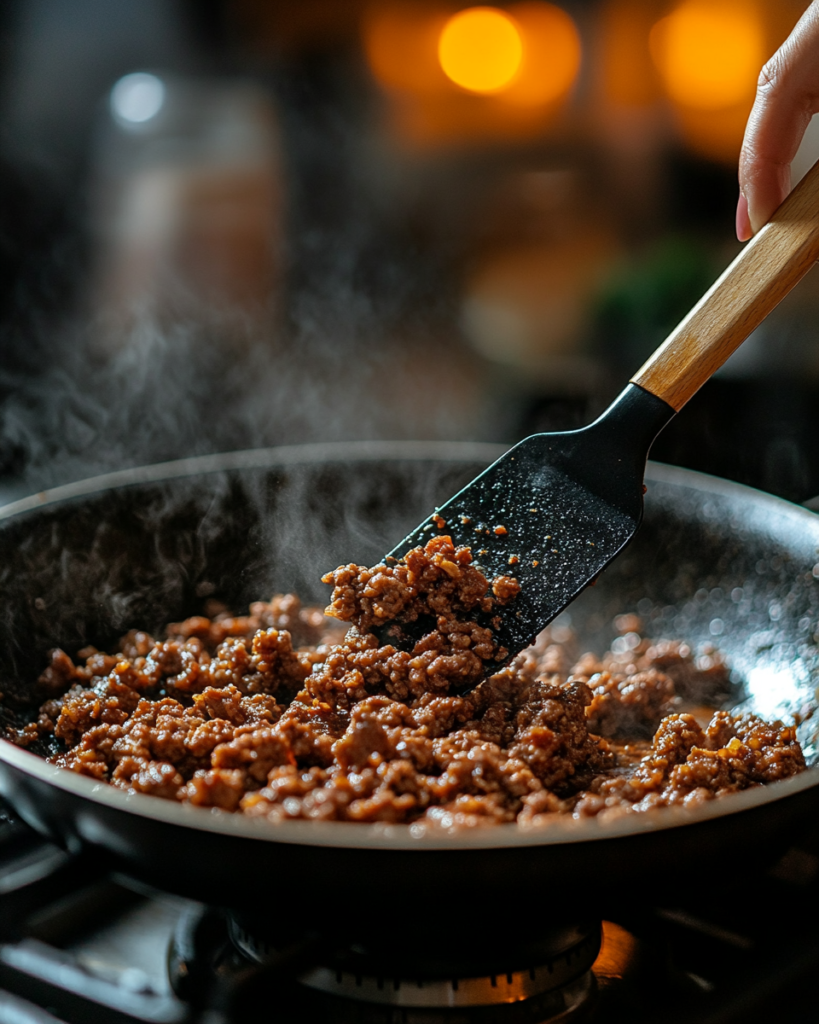 Drain excess fat if needed, leaving just enough to keep the mixture moist. Stir in chili powder, cumin, paprika, salt, and black pepper. Mix thoroughly so the seasoning coats the beef evenly.