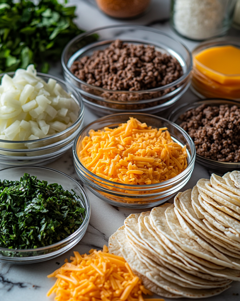 Together, these ingredients create cheesy beef quesadillas with layered texture, savory depth, and a satisfying contrast between crisp tortilla and soft melted interior.