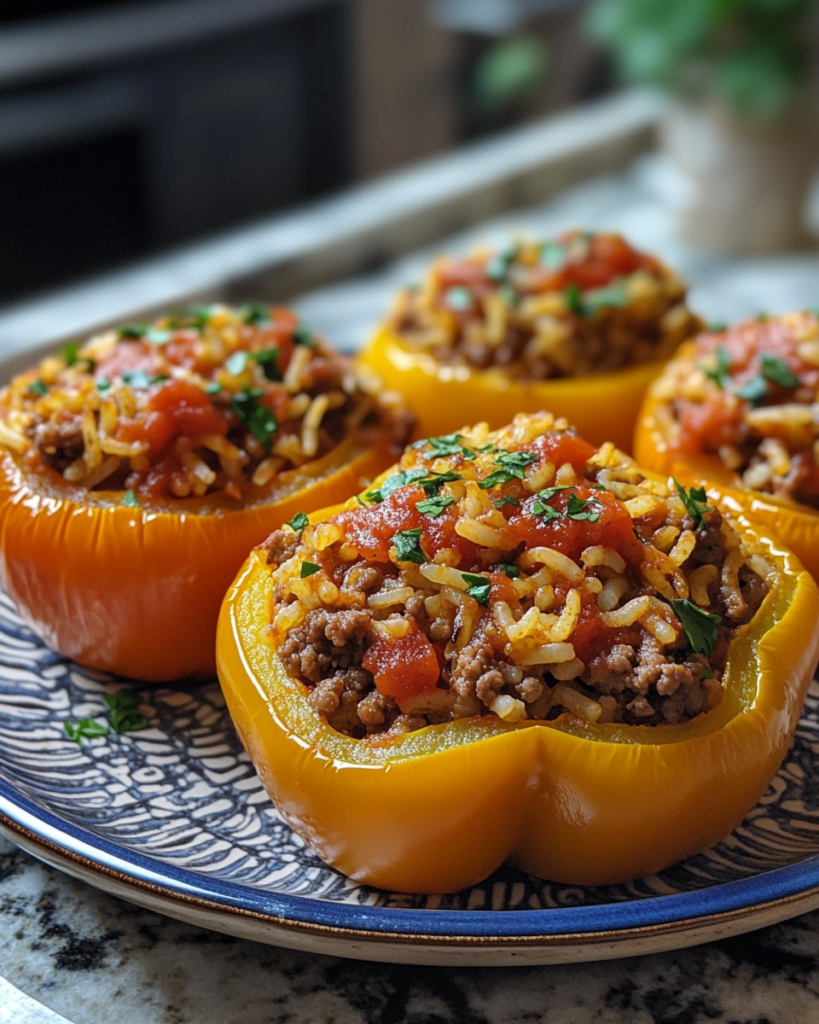 Classic Stuffed Peppers with Ground Beef is a warm oven-baked dish featuring tender bell peppers filled with seasoned ground beef, rice, tomatoes, and herbs. As it bakes, the peppers soften while the filling becomes rich and flavorful, creating a balanced meal inside an edible shell.