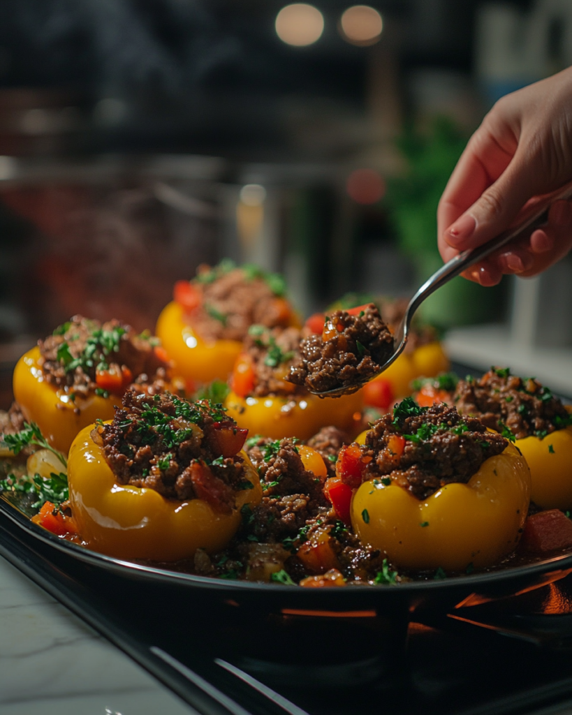 Preheat the oven to 375°F. Arrange the prepared bell peppers in a baking dish. Spoon the beef and rice mixture into each pepper, pressing gently to pack the filling without overflowing.