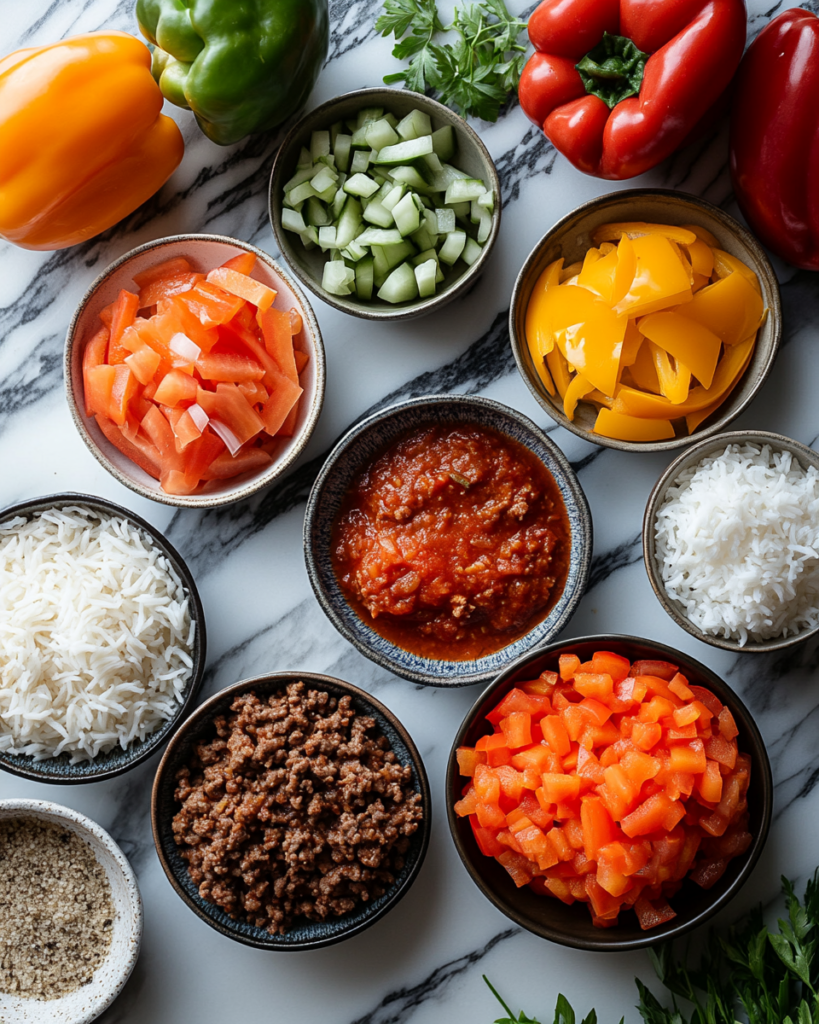 Bell peppers form the structure of this recipe. They soften in the oven while still holding their shape, creating a natural bowl for the filling. Red, yellow, or orange peppers offer a sweeter flavor, while green peppers bring a slightly more earthy taste. Choosing a mix adds color and balance to the dish.