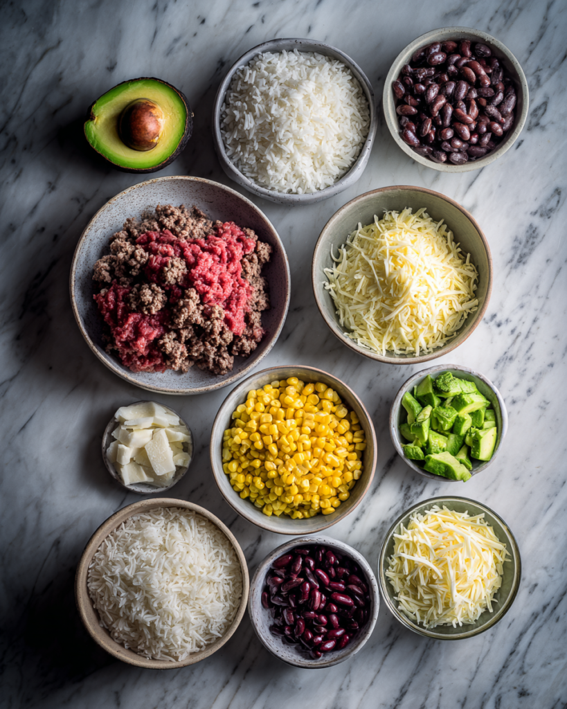 Juicy ground beef seasoned with classic Mexican spices forms the protein base, while rice or quinoa adds substance. Black beans and corn contribute heartiness and natural sweetness. Fresh toppings like diced tomatoes, lettuce, avocado, and a sprinkle of cheese add brightness and creaminess, making each bite flavorful and balanced.