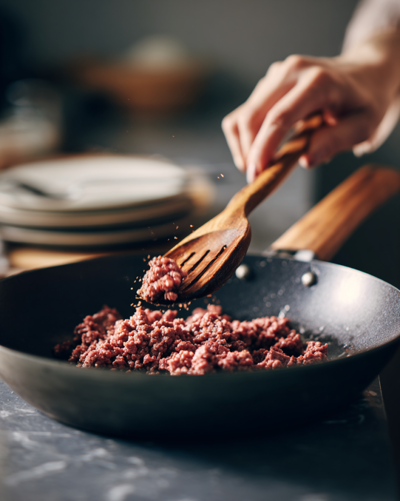 3. Add the ground beef to the skillet, breaking it apart with a wooden spoon. Cook for 6–8 minutes until browned and no longer pink. Drain excess fat if necessary to keep the dish from becoming greasy.