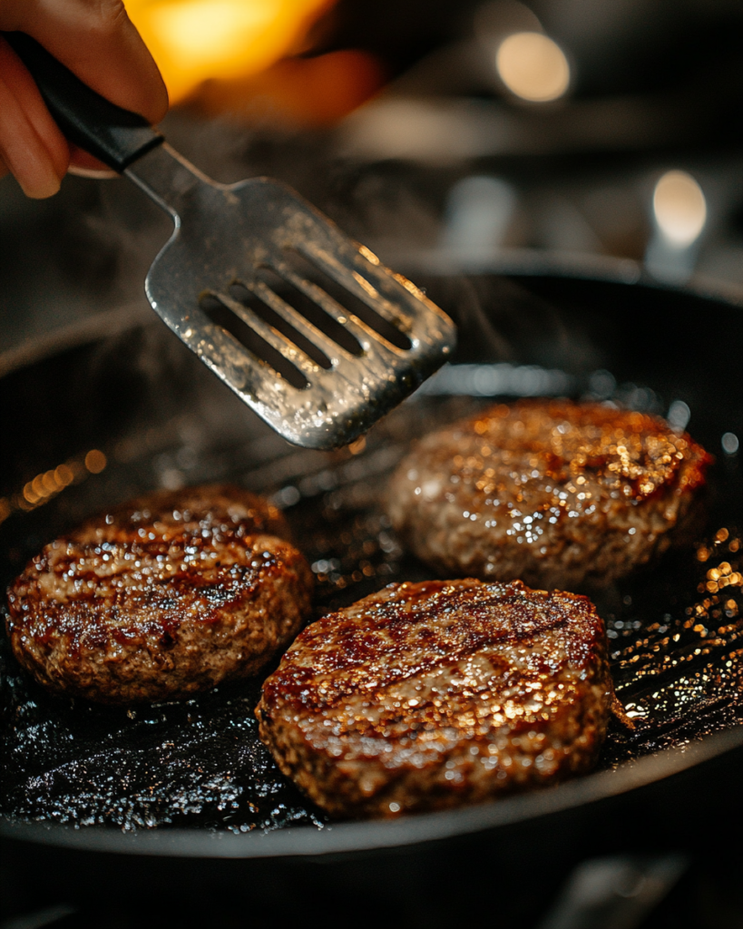 Reduce heat slightly if needed and continue cooking until the patties are fully cooked through. The inside should be juicy and no longer pink. Cooking time will vary depending on thickness, usually around 4–6 minutes per side.