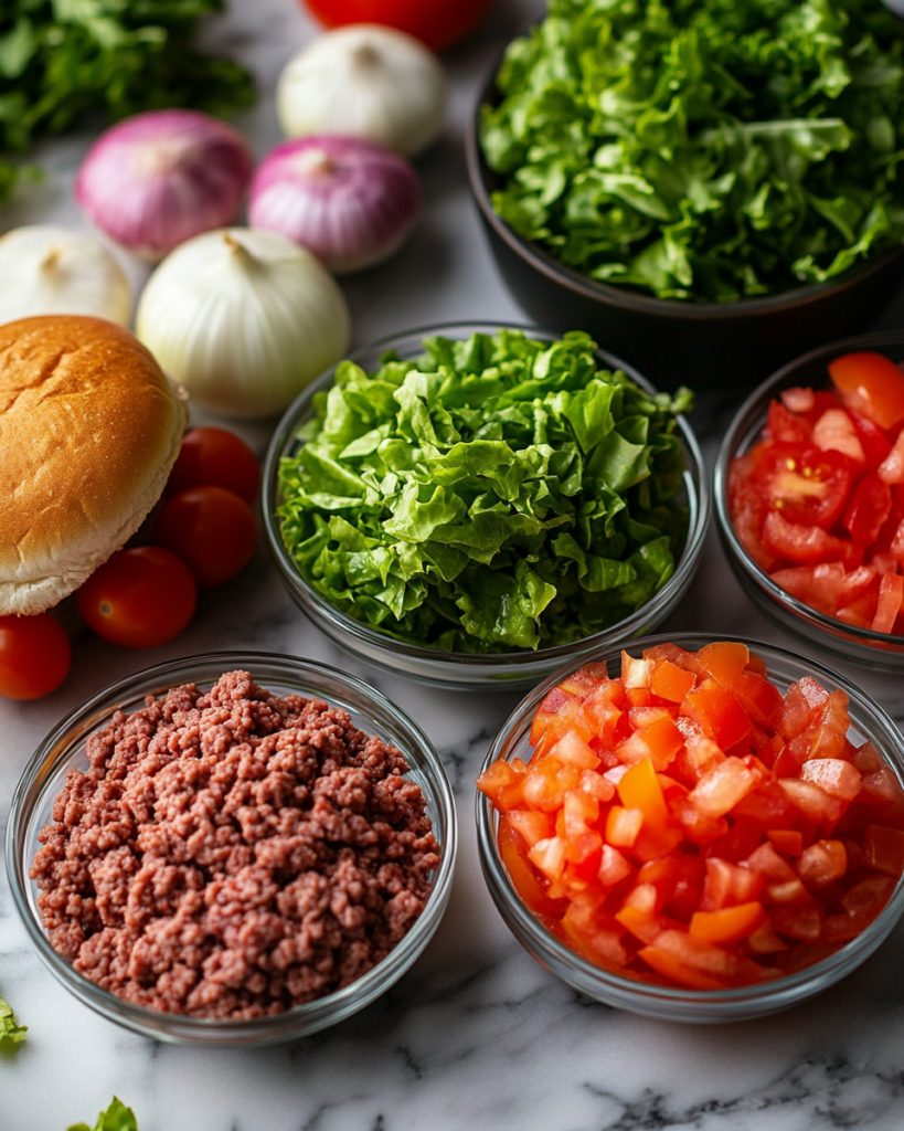 Ground beef is the core ingredient in this dinner. A lean-to-medium blend, such as 85/15 or 90/10, works best because it balances juiciness with a lighter profile. Too lean can make the patties dry, while too fatty can make them heavy. The beef is seasoned simply so its natural flavor remains central.