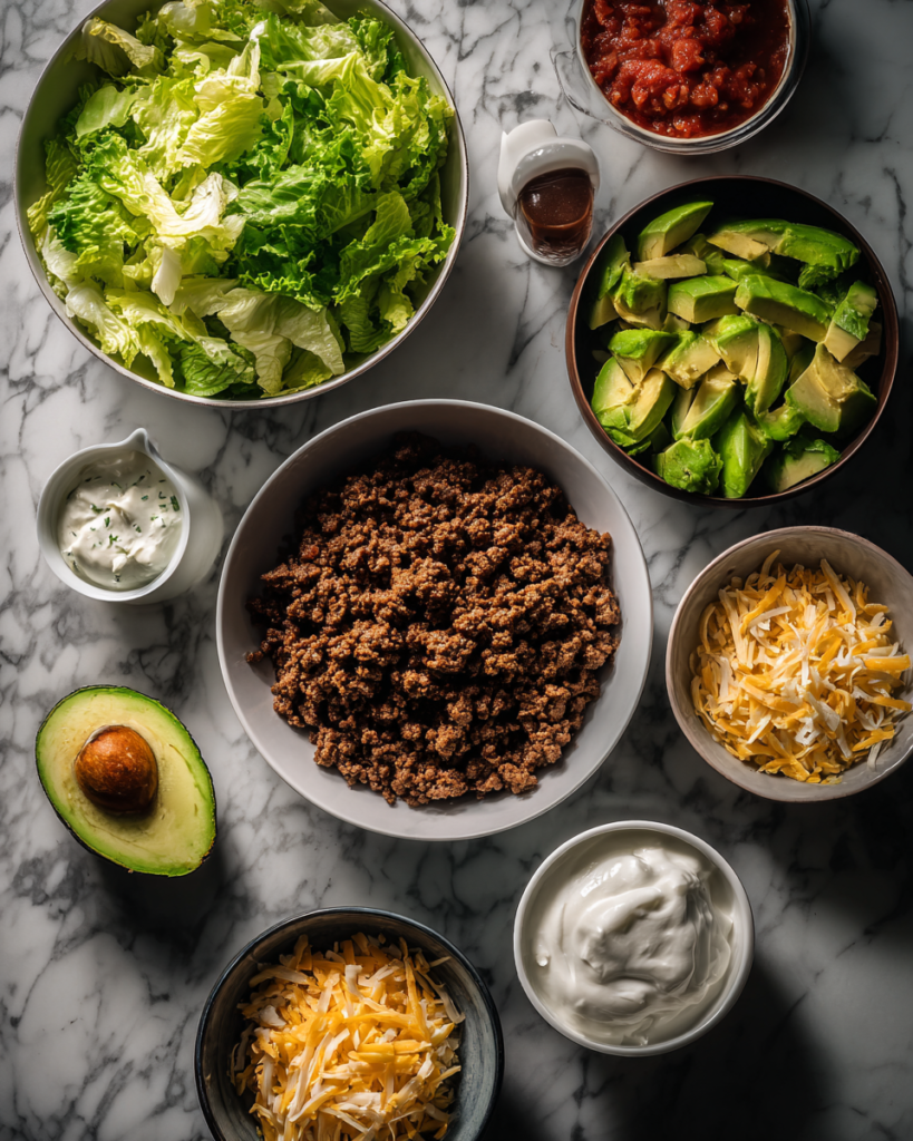 Ground turkey or chicken works as a leaner protein alternative. Use shredded lettuce or a mix of greens if you prefer a lighter texture. Cheese can be swapped with a dairy-free option, and Greek yogurt can replace sour cream for a lower-calorie topping.