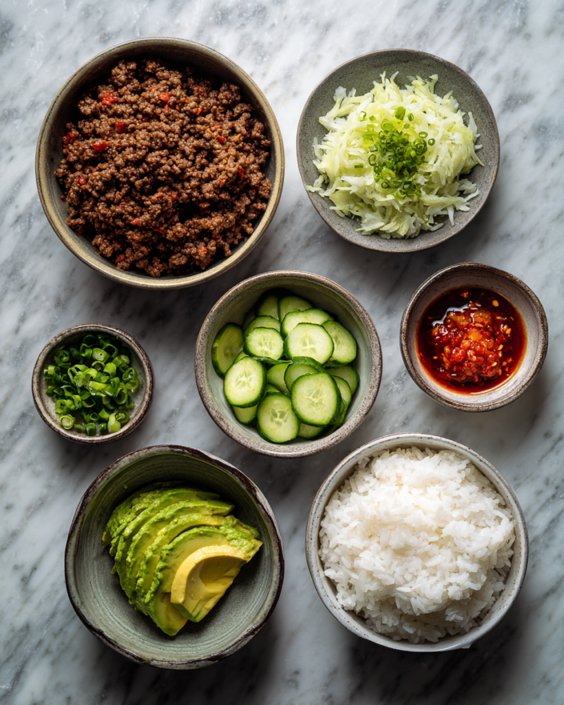 The success of a quick ground beef dinner bowl comes from combining simple ingredients that complement each other in both flavor and texture. Ground beef is the centerpiece, offering rich, savory depth and a satisfying bite. Choosing an 80/20 or 85/15 blend provides a good balance of flavor and tenderness without excessive grease.