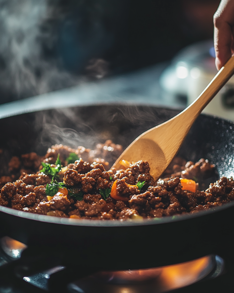 Start by heating a large skillet or heavy-bottomed pot over medium heat. Add the olive oil, then the ground beef. Break the meat apart with a spoon and cook until browned and no longer pink. This should take about 5–7 minutes. Drain excess fat if necessary, but leave a small amount for flavor.