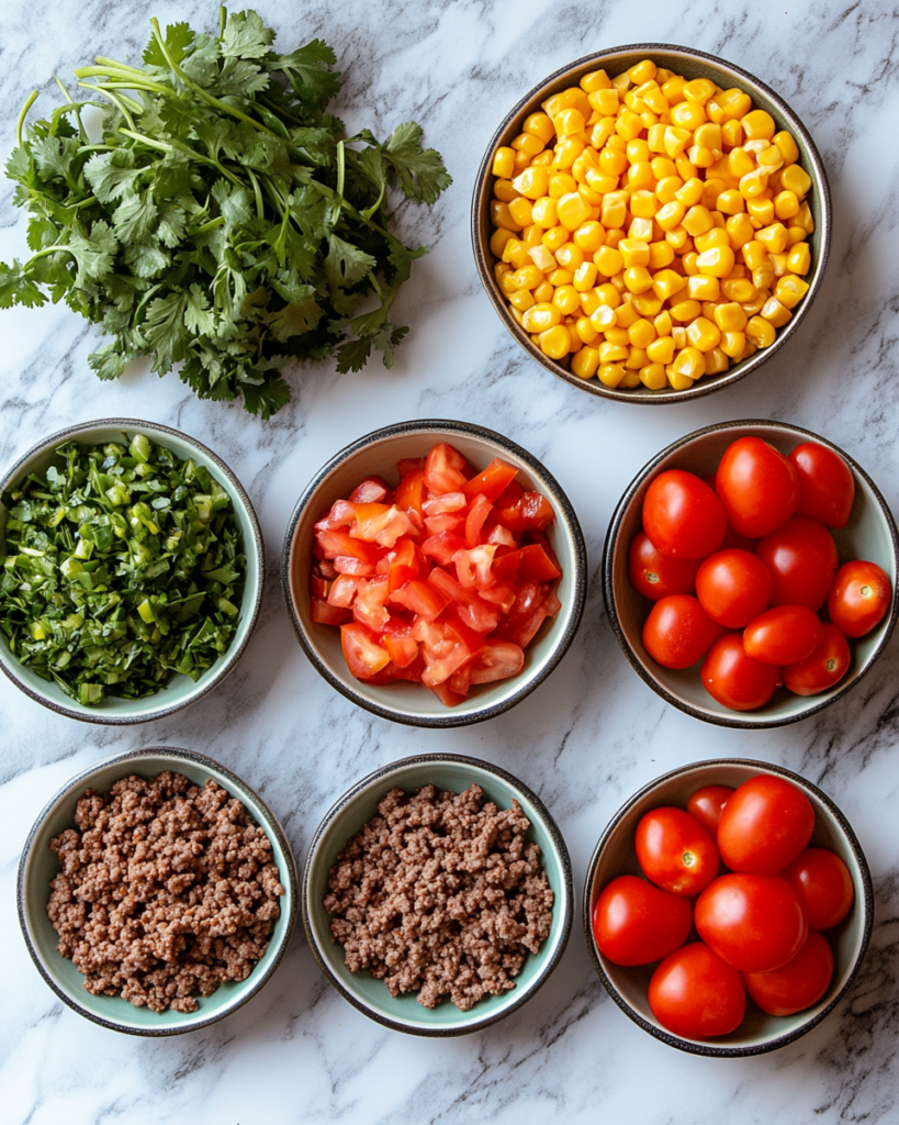 Taco beef skillet relies on a handful of familiar ingredients that come together to build deep, layered flavor. Ground beef is the foundation, providing richness and a savory base that absorbs seasoning well. A leaner beef can be used for a lighter result, while ground turkey or chicken also works for a different profile.